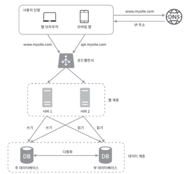 이제 파트 1에서 설명한 내용과 데이터베이스 다중화가 구현된 시스템의 그림은 아래와 같다.