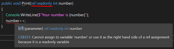public void Print(ref readonly int number) { Console.WriteLine($"Your number is {number}"); number++; // This will make the compiler issue an error; }Visual Studio에서 볼 수 있는 내용은 다음과 같습니다.